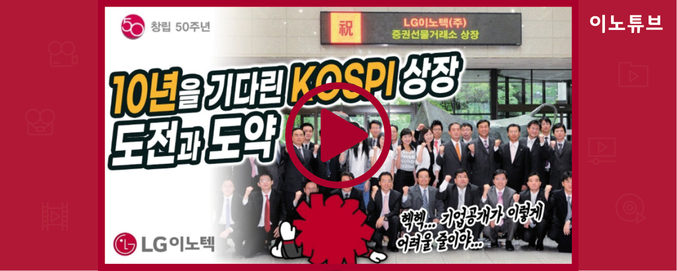 People&Culture [LG이노텍 50주년 이노텍스토리]10년을 기다린 KOSPI 상장 도전과 도약 2020. 11. 5. 18:12 [LG이노텍 50주년 이노텍스토리]10년을 기다린 KOSPI 상장 도전과 도약 LG이노텍 유튜브 바로보기 ▶youtu.be/JMXtfledct8 공유하기 게시글 관리 LG이노텍 Newsroom 'People&Culture' Related Articles [LG이노텍 50주년 이노텍스토리] 새로이 눈뜨다, LG이노텍이 꿈꾸는 미래 New 비전 수립 [2020년 LG이노텍 브랜드 필름] '미래를 꿈꿀 수 있는 또 다른 혁신, LG이노텍이 만들어 갑니다' [이노하이? 하이!] 이노하이가 알려주는 LG이노텍 인턴십 채용(INNO-STEP, 채용연계형 인턴십) LG이노텍 예비광학인재들의 하루!(연세대 광과학공학과 소개)