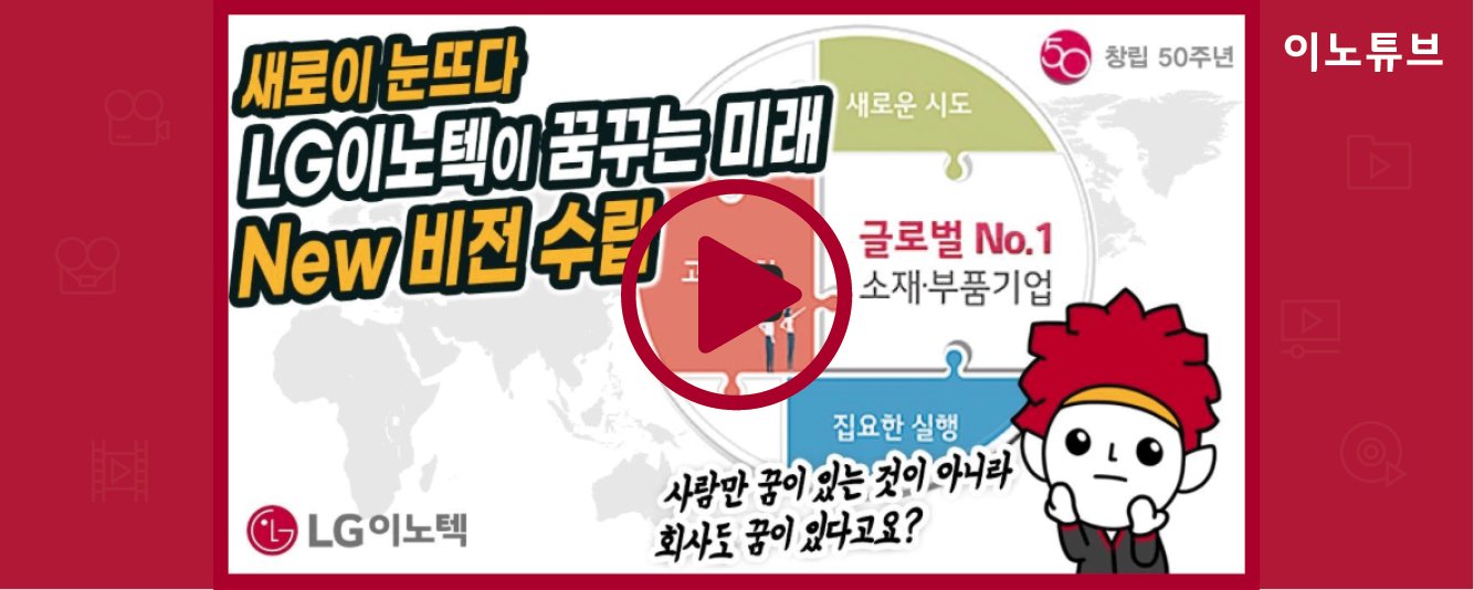 People&Culture [LG이노텍 50주년 이노텍스토리] 새로이 눈뜨다, LG이노텍이 꿈꾸는 미래 New 비전 수립 2020. 11. 26. 16:17 [LG이노텍 50주년 이노텍스토리] 새로이 눈뜨다 LG이노텍이 꿈꾸는 미래 New 비전 수립 LG이노텍 유튜브 바로보기 ▶youtu.be/PLjWxQZyU2w 공유하기 게시글 관리 LG이노텍 Newsroom 'People&Culture' Related Articles [LG이노텍 50주년 이노텍스토리] PRIDE LG이노텍 사회적 거리두기 하면서 사회공헌 활동을 한다? LG이노텍 비대면 온택트 사회공헌 활동 [2020년 LG이노텍 브랜드 필름] '미래를 꿈꿀 수 있는 또 다른 혁신, LG이노텍이 만들어 갑니다' [LG이노텍 50주년 이노텍스토리]10년을 기다린 KOSPI 상장 도전과 도약