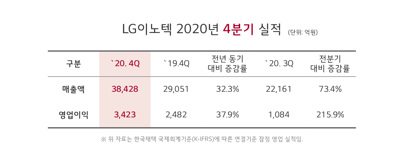 LG이노텍(011070, 대표 정철동)이 2020년 4분기에 한국채택 국제회계기준(K-IFRS)으로 매출 3조8,428억원, 영업이익 3,423억원을 기록했다. 전년 동기 대비 매출은 32.3%, 영업이익은 37.9% 증가했다. 전분기 대비 매출은 73.4%, 영업이익은 215.9% 증가했다.