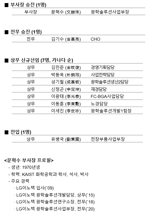 LG이노텍은 카메라 모듈 및 3D센싱 모듈 사업의 글로벌 1등 지위를 확고히 하고 사업 성장에 크게 기여한 문혁수 광학솔루션사업부장 전무를 부사장으로 승진시켰다.