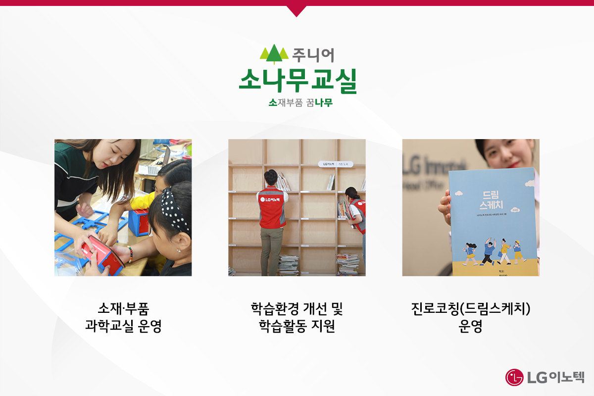 앞으로도 LG이노텍은 아이들이 교육을 통해 다양한 지식을 얻고, 풍부한 지적 역량을 갖춘 인재로 성장할 수 있도록 주니어 소나무 교실을 통해 다양한 지원 활동을 전개해 나갈 것입니다.