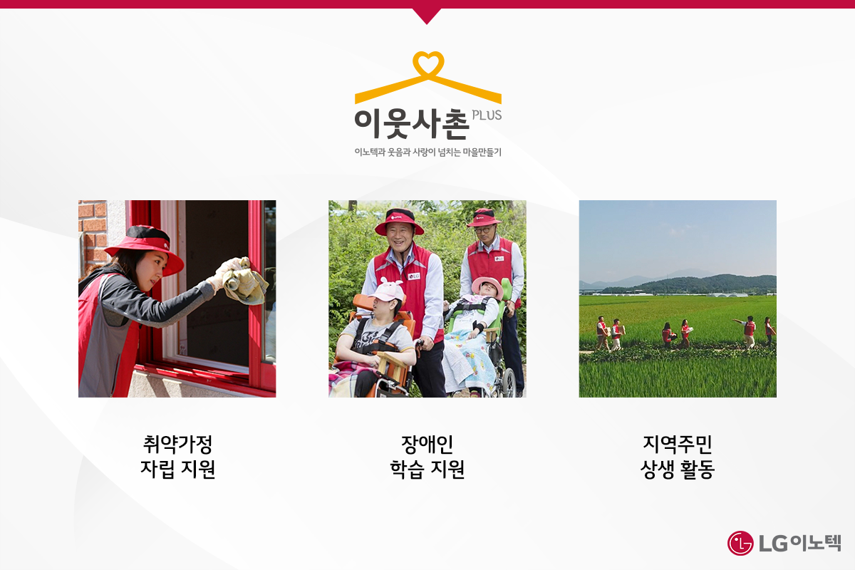 이웃사촌 PLUS는 지역사회 주민들과 이웃사촌처럼 함께하며 취약계층의 자립을 돕자는 취지로 진행하는 LG이노텍의 대표 사회공헌 프로그램입니다. 국내 6개 사업장 인근 기관과 파트너십을 유지하며, 저소득가정, 보훈가정, 탈북민 가정, 독거어르신 등 다양한 계층을 지원합니다. 또한 장애인 복지 향상을 위한 학습 환경 개선, 문화체험, 교육, 재활 등의 활동을 지속하고 있습니다.