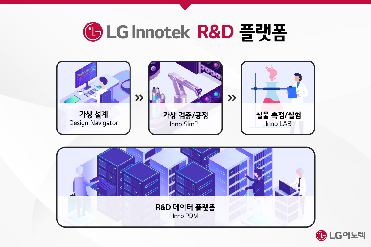 LG이노텍은 제품 설계에서 생산까지, 전 과정에 DX 기술을 도입하고 있습니다. DT 기술을 활용하고 있는 영역은 크게 AI/빅데이터 기반의 R&D 플랫폼과 스마트 팩토리로 구성되어 있어요. 보다 빠르고 정밀하게 제품을 설계하고, 그 동안의 생산 데이터로 최적화된 가상의 개발·검증·생산 프로세스를 구축하여 고객에게 더욱 새롭고 혁신적인 가치를 제공하는 것이 LG이노텍의 목표입니다.