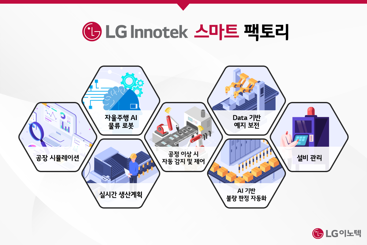 LG이노텍의 스마트 팩토리는 광학, 기판, 전장에 이르는 각 사업 부문별 특성에 맞춰 추진되고 있어요. 자동화, 정보화 기반 지능화를 통해 실시간 생산·품질·설비 관리 체계를 갖추고 있습니다. 지능화 솔루션을 선도적으로 적용하여 생산 전 과정을 데이터로 연결하고, AI 기반 검사·제어·판정 시스템으로 생산라인의 효율성을 높이는 중입니다.