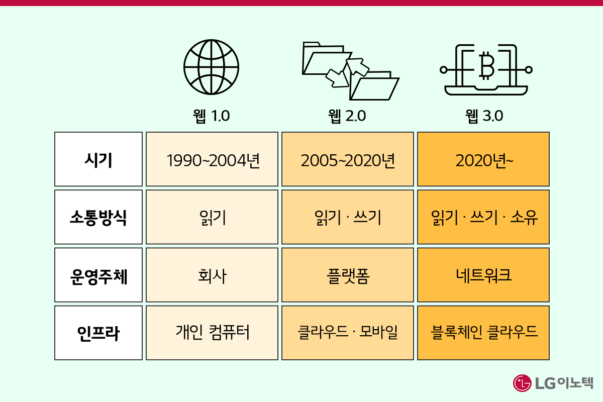 하지만 웹3.0은 블록체인 기술이 발전하면서 다시 주목받기 시작했어요. 웹3.0은 필요한 정보만을 재편집하여 제공이 가능한 인공지능 웹으로, 탈중앙화와 개인화가 웹3.0의 핵심 가치인데요. 중앙 서버 이용자들의 권한이 줄어들고, 가짜뉴스 유포ㆍ명예훼손 등의 권리 침해 이슈가 발생하면서 훼손되지 않은 데이터의 중요성이 대두되고 있다는 점 또한 웹3.0의 등장하게 된 배경입니다. 이러한 불상사 또한 블록체인으로 방지할 수 있기에 더욱 블록체인의 기술 개발이 필요한 것입니다.
