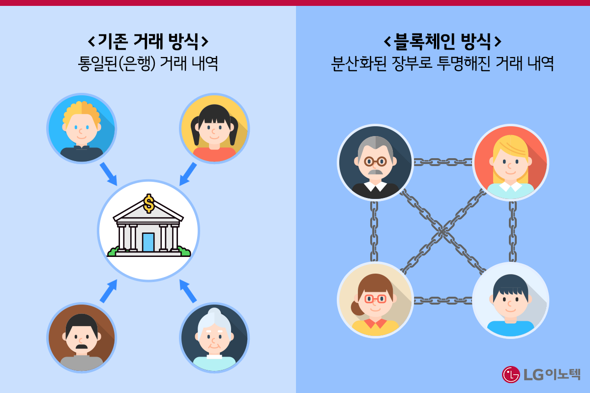 블록체인은 분산원장기술(DLT: Distributed Ledger Technology)의 효율성을 극대화한 것으로, 탈중앙화를 핵심 키워드로 두고 있습니다. 분산원장기술은 분산된 네트워크가 데이터베이스를 공유하고 동기화하는 기술을 말해요. 중앙서버를 두고 있는 중앙원장기술에 비해 투명성이 보장되는 것이죠. 중앙 집중형 방식은 중앙관리자가 용역을 제공하고 이를 사용하는 개인이 대가(수수료)를 지급하는데요. 분산원장기술 덕에 이체비용 등의 거래비용을 대폭 절감할 수 있다는 것도 블록체인의 장점입니다.