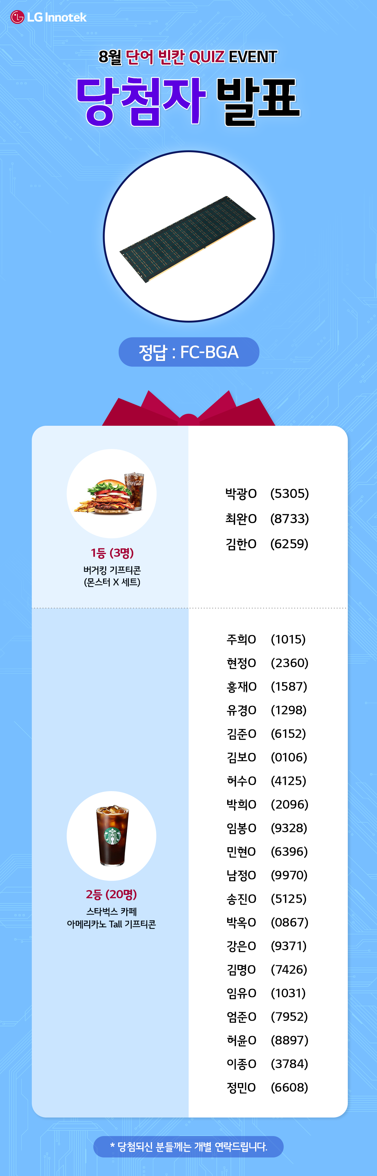 지난 8월 16일~8월 31일 진행된 ‘LG이노텍 8월 빈칸 퀴즈 이벤트’에 참여해주신 모든 분들께 감사드리며, 당첨자를 발표 합니다!