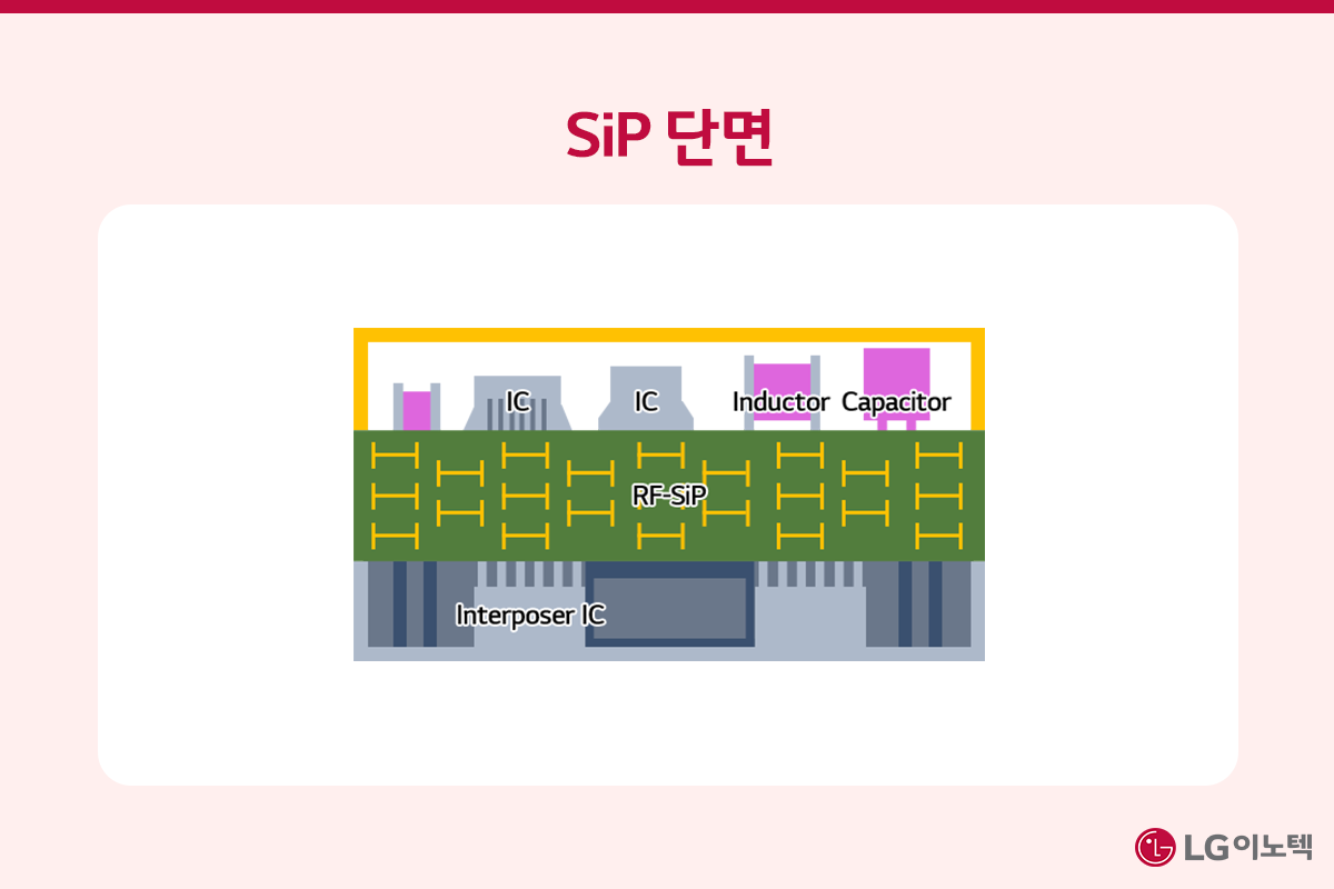 SiP는 시스템 인 패키지(System in Package)의 약어로, 한 패키지 안에 2개 이상의 IC를 묶어 단일 칩으로 작동하도록 만드는 기술입니다. 기판 위에 서로 다른 기능의 능동소자*들을 하나의 패키지로 통합하면 경박단소는 물론 소자 간 접속 경로를 좁혀 고성능과 전기적 특성을 모두 확보할 수 있죠.