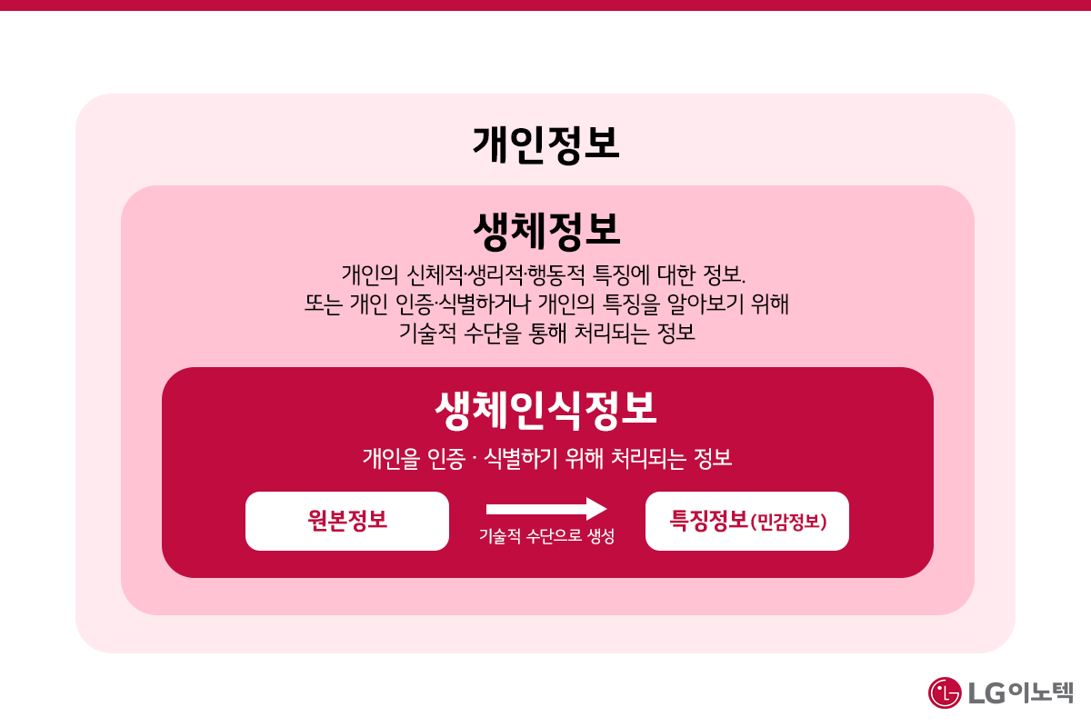 생체정보는 크게 원본정보와 특징정보로 나뉘는데요. 원본정보는 개인을 인증 또는 식별하기 위해 수집하거나 입력한 정보예요. 특징정보는 기술적 수단으로 원본정보의 특징을 추출하여 생성한 정보입니다. 특징정보는 민감정보라고도 하는데요. 개인정보보호법 시행령 제18조 제3호에는 민감정보를 ‘개인의 신체적, 생리적, 행동적 특징에 관한 정보로서 특정 개인을 알아볼 목적으로 일정한 기술적 수단을 통해 생성한 정보’로 규정짓고 있습니다. 참고로 민감정보에는 개인의 사상이나 신념, 노동조합 또는 정당의 가입ㆍ탈퇴 내역, 정치적 견해, 건강 및 유전자 정보, 범죄경력자료, 인종 또는 민족에 관한 정보 등도 포함하고 있어요.