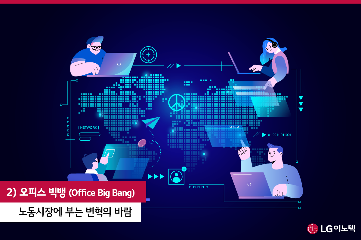 노동 환경이 폭발적으로 변하고 있다는 의미를 표현한 말입니다. 평생직장의 개념이 사라지고, 이직이 곧 경력 관리의 수단이자 직장인의 버킷리스트가 되었죠. 이에 기업에서도 인재들의 마음을 사로잡을 수 있는 성과 제도와 복리후생 제도들을 마련하고 있고요. 팬데믹을 기점으로 경험하게 된 재택근무는 집에서도 충분히 업무를 수행할 수 있다는 것을 알려주었으며, 이에 몇몇 기업들은 원격근무ㆍ워케이션ㆍ거점오피스 등의 제도들로 물리적 공간의 제약을 허물고 있습니다. 디지털화를 계기로 플랫폼 노동자와 프리랜서의 규모 또한 커지고 있고요.