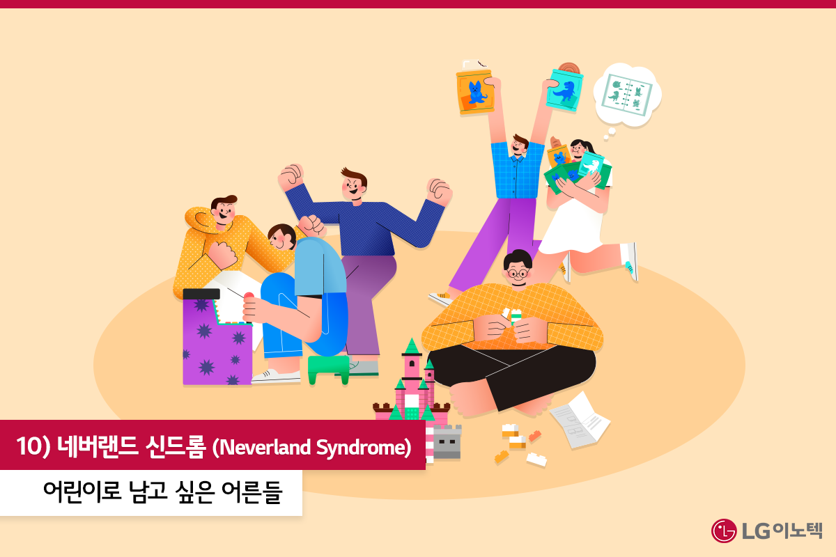 최근 공주 액세서리 세트나 캐릭터 씰이 들어가 있는 빵을 구매해본 적 있으신가요? 프라모델이나 RC카 등의 장난감을 갖고 놀아 보기도 하셨나요? ‘어릴 때가 좋았지’라는 입버릇처럼, 한국에서는 나이보다 어리게 사는 것이 미덕이자 트렌드가 되고 있습니다. 네버랜드 신드롬은 크게 3가지 유형으로 나뉘는데요. 어린 시절에 가지고 놀던 장난감을 구매하거나, 외모 유지ㆍ승진 거부 등으로 나이 드는 것을 받아들이려 하지 않거나, 아이들처럼 재밌고 명랑하게 노는 유형으로 나뉘죠.