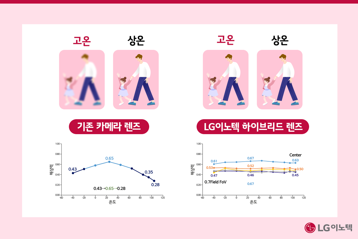 LG이노텍은 고도의 기술력으로 큰 폭을 오가는 기온 변화에도 고해상도를 유지하는 렌즈를 구현하는 데 성공했어요. -40°C부터 100°C도 범위 내에서 자체 실험을 거친 결과, LG이노텍의 하이브리드 렌즈는 온도를 막론하고 일정한 해상도를 유지하는 것을 확인할 수 있었습니다.