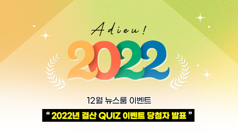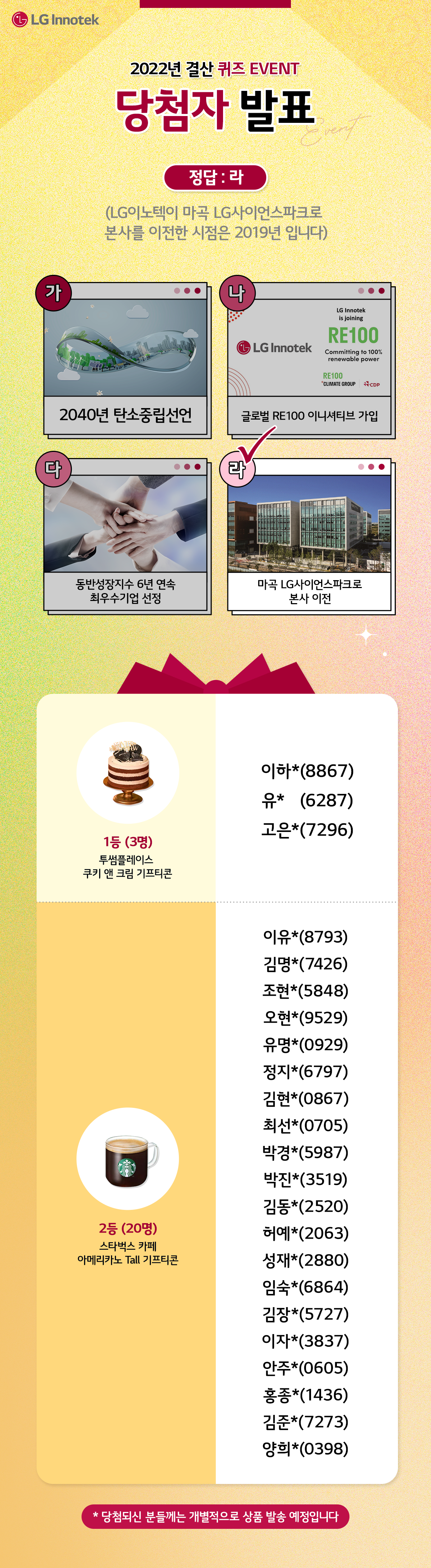 지난 22년 12월 8일 (목) ~ 12월 21일 (수) 진행된 ‘LG이노텍 2022년 결산 퀴즈 이벤트'에 참여해주신 모든 분들께 감사드리며, 당첨자를 발표 합니다!