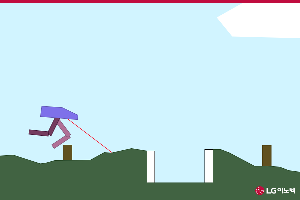 단순한 도형으로 이뤄져 있어 고전 게임의 스크린 샷처럼 느껴지는 위 그림은 AGI에 가장 근접하다고 평가된 프로그램, 포엣(POET)의 맵을 재현한 것입니다. 글로벌 운송 네트워크 기업 우버(Uber)의 AI 연구원이 개발한 이 소프트웨어 속 봇(bot)은 평지부터 시작해서 구불구불한 언덕, 골짜기, 장애물, 높은 계단 등 포엣이 무작위로 만들어준 코스를 통해 훈련을 합니다. 비틀거리느라 제대로 걷지도 못했던 봇은 천천히 걷기 시작하고, 한쪽 다리만 뻗어 장애물을 넘으려 노력하고, 계단을 데굴데굴 구르는 등 시행착오를 겪죠. 그 과정을 통해 봇은 뛸 수도 있고, 장애물을 가볍게 넘어갈 수 있는 수준으로 성장합니다. 봇이 직접 학습하며 걷는 방법을 익혔으니 AGI의 희망을 품은 프로그램이라 해도 과언은 아니겠죠. 실제 봇이 성장하는 모습은 아래의 링크를 통해 확인하실 수 있습니다.