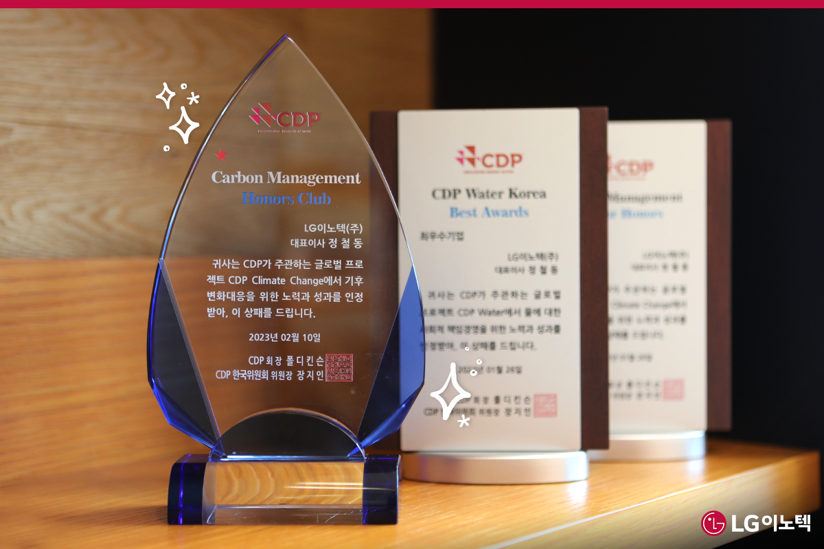 진정성 있는 탄소 경영은 ‘탄소경영 최우수기업’이라는 영광을 안겨주었습니다. 국제 비영리기구 CDP(Carbon Disclosure Project, 탄소정보공개 프로젝트) 한국위원회가 매년 개최하고 있는 CDP Korea Awards는 기후변화 대응 전략과 감축 목표를 적극적으로 설정하고 추진하는 탄소경영 기업 최상위 5개 기업을 선정하는데요. 2022년에는 LG이노텍이 5개 기업 중 하나로 선정되어 탄소경영 아너스클럽(Carbon Management Honors Club)을 수상했습니다.