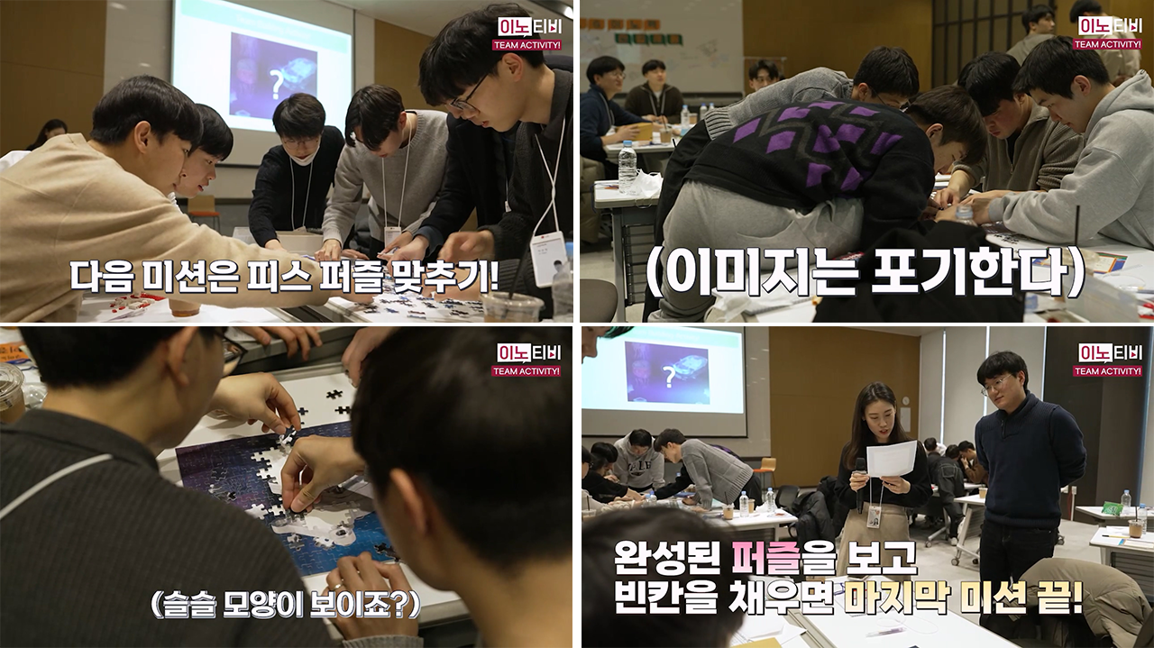 1교시의 마지막 미션! 몇천 개에 달하는 퍼즐을 맞추기 위해 신입사원들은 다시 합심하기 시작했는데요. 보이시나요? 누구보다 빠르게 남들보다 다르게 퍼즐을 맞추는 신입사원들의 피땀눈물이… 💦