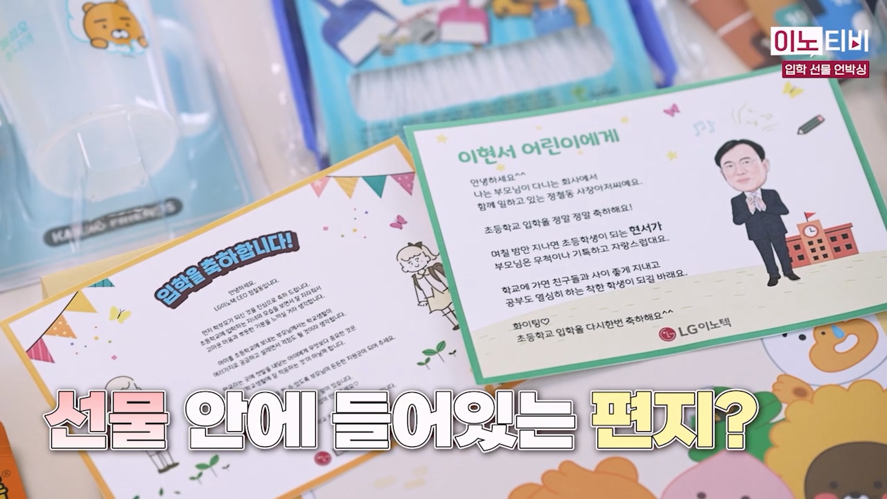 입학선물 키트 안에는 LG이노텍의 CEO, 철동님의 축하 편지가 들어있었답니다. 💌 편지를 본 아이들은 철동님을 ‘정철동 사장 아저씨’라고 부른대요. 정철동 사장 아저씨가 준비한 선물, 함께 살펴보시죠!