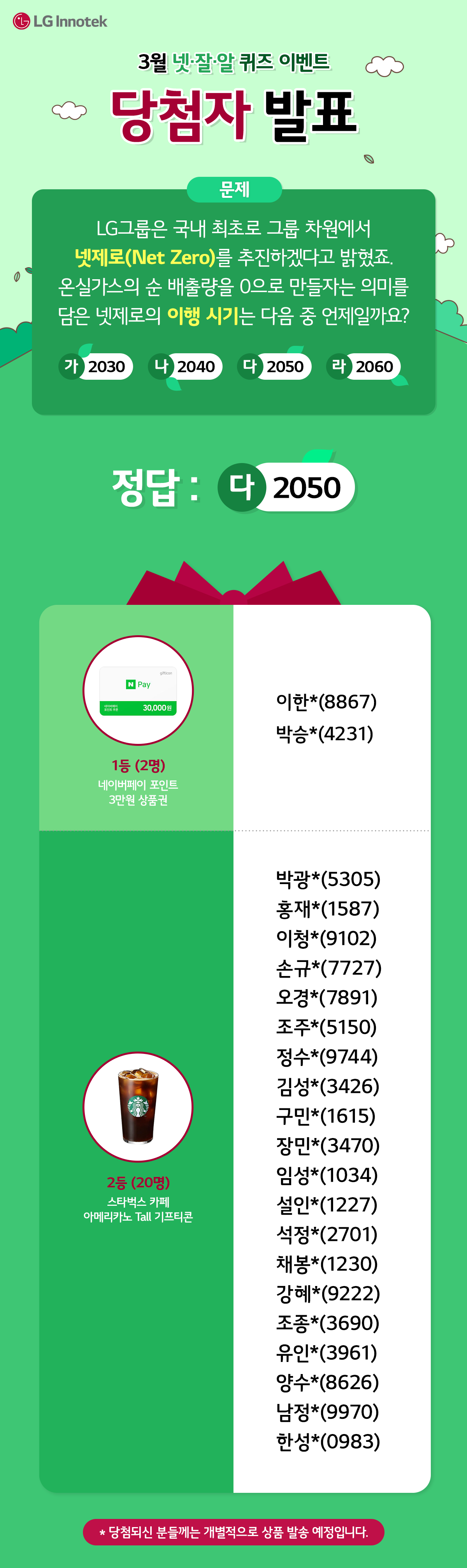 지난 23년 3월 16일(목)~3월 31일(금) 진행된 ‘LG이노텍 3월 넷잘알 퀴즈 EVENT’에 참여해주신 모든 분들께 감사드리며, 당첨자를 발표합니다!