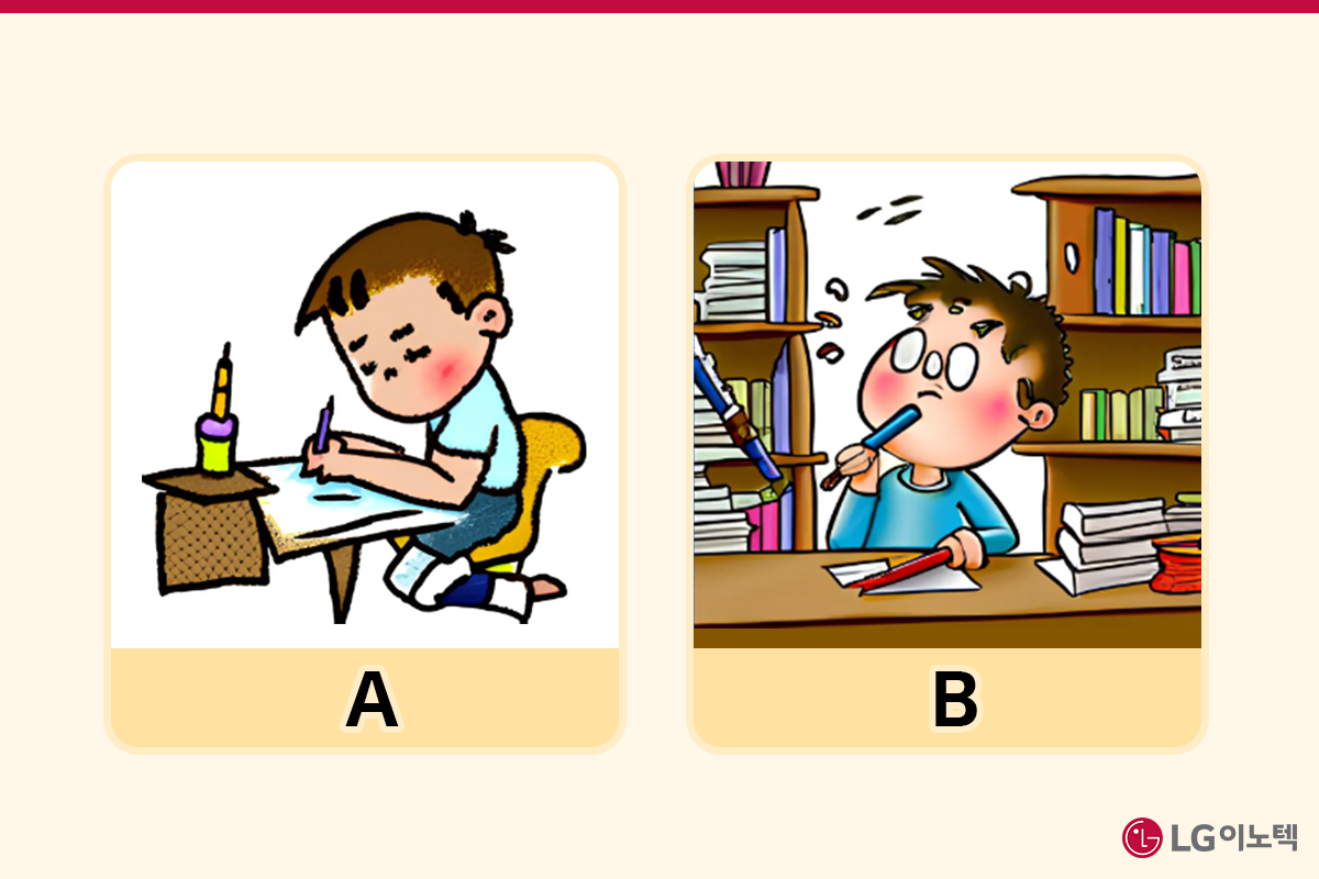 B) “양장본으로 된 책이 가득 꽂혀있는 책장 옆 책상에서 미간을 찌푸린 채로 연필 끝을 깨물며 공부하고 있는 남자아이”