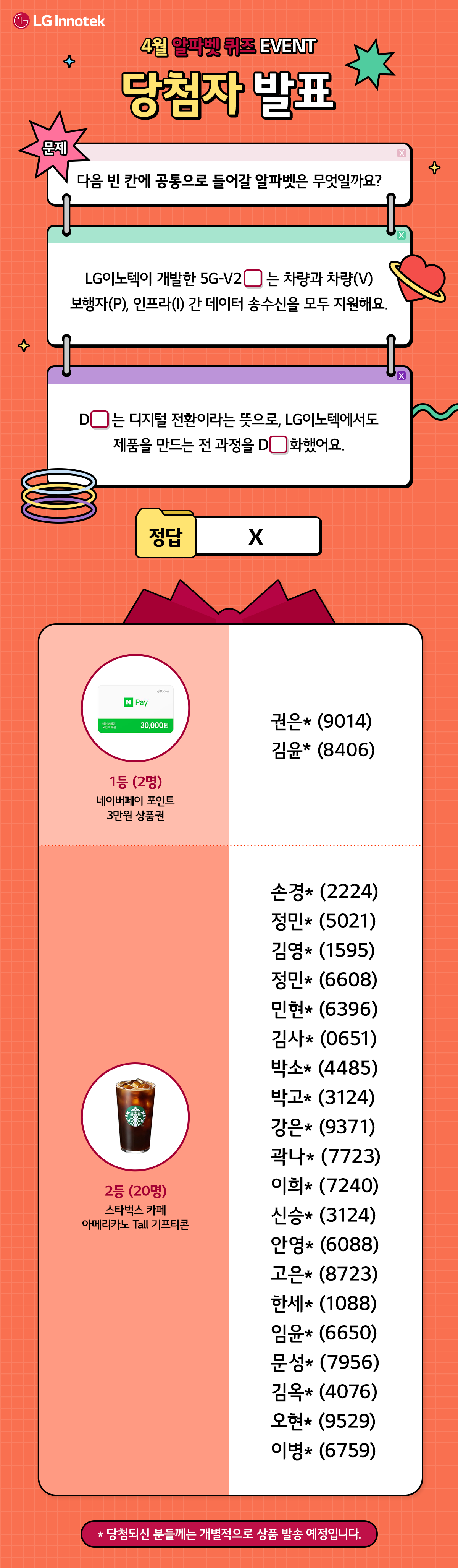 지난 23년 4월 12일(수)~4월 30일(일) 진행된 ‘LG이노텍 4월 알파벳 퀴즈 EVENT’에 참여해주신 모든 분들께 감사드리며, 당첨자를 발표합니다!