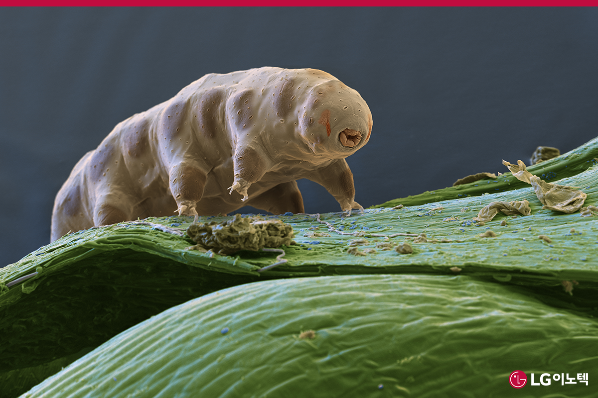 애벌레처럼 생긴 이 생물은 바로 곰벌레, 물곰이라고도 불리는 완보동물(타디그레이드)입니다. 성체의 최대 크기가 1.5mm이고 작은 것은 0.1mm가 채 되지 않지만, 이 생물은 우주 최강 생명체라고 불립니다. 영하 273℃, 영상 151℃에서도 살아남는 데다, 생물에게 치명적인 농도의 방사성 물질 1,000배에 달하는 양에 노출되어도 죽지 않기 때문이죠. 물과 음식물이 없어도 수십 년을 버틸 수 있을 뿐만 아니라 진공 상태나 높은 압력 속에서도 생존할 수 있어요. 휴면 상태로 120년간 지낸 완보동물이 발견되기도 했죠.