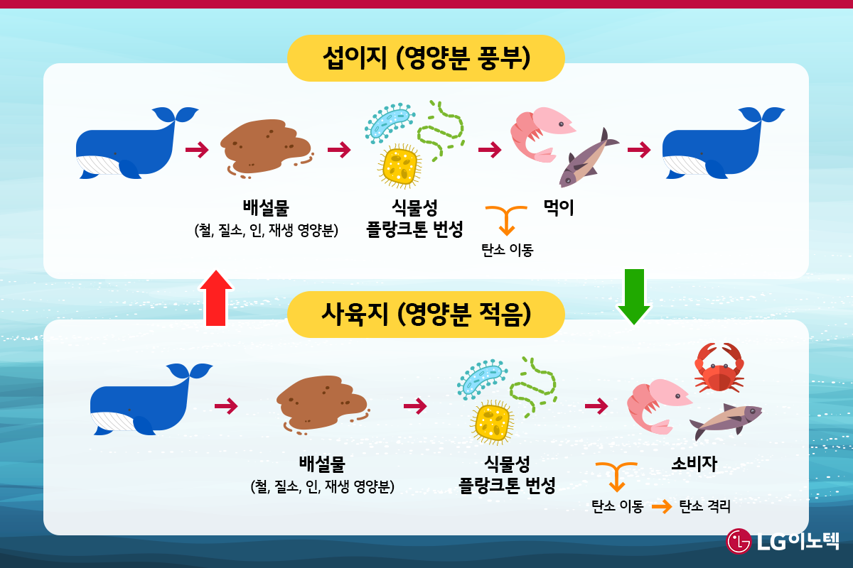 좀 더 자세히 설명해 보겠습니다. 고래의 배설물에는 철, 질소, 인 등의 영양분이 많이 함유되어 있습니다. 고래의 배설물 주변으로 번성하게 된 식물성 플랑크톤은 광합성을 통해 대기 중의 이산화탄소를 흡수하고요. 탄소를 머금은 식물성 플랑크톤은 동물성 플랑크톤의 먹이가 되거나, 다른 미세 영양분과 함께 바다로 가라앉습니다. 이렇게 눈처럼 가라앉는 식물성 플랑크톤을 바다 눈이라고 하는데요. 바다 깊숙한 곳으로 가라앉는 만큼 탄소는 격리되고, 그만큼 온난화를 방지하는 데 큰 역할을 하는 것입니다. 고래는 수압 때문에 깊은 곳에서 배설물을 배출할 수 없어 해수면 근처로 올라와 배설을 하는데요. 그래서 식물성 플랑크톤도 더 많이 생성되고, 자연히 탄소 격리량도 높아진답니다.
