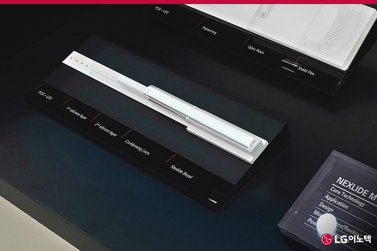 넥슬라이드는 LG이노텍의 자동차 조명 제품이자 브랜드 이름입니다. 3개의 영어 단어 Next, Lighting, Device를 조합하여 만든 이름인데요. 차세대 광원이라는 의미를 담은 만큼 조명 부품에 적용할 수 있는 혁신기술을 개발하여 성능과 디자인을 모두 충족시키는 모델을 개발하고 있습니다. 얇은 기판에 발광다이오드(LED) 패키지와 광학필름을 부착해 만든 넥슬라이드-M은 CES 2023의 오픈 부스에서 처음으로 선보인 제품이었는데요. 어디든 적용할 수 있는 유연성과 균일한 밝기는 물론 아름다운 디자인까지 갖춰 많은 관심을 받았습니다!