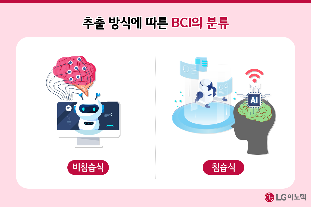 BCI는 추출 방식에 따라 비침습식과 침습식으로 나뉩니다. 비침습식 BCI는 피부를 관통하거나 절개하지 않고 뇌파를 읽는 기계를 장착하여 외부에서 간접적으로 신호를 측정하는 방식이에요. 혹시 여러 개의 전선이 이어져 있는 골무 모양의 장치를 쓴 모습을 본 적이 있으신가요? 이처럼 비침습식 BCI는 머리에 센서를 장착하여 뇌파를 읽어냅니다. 뇌파를 읽는 뇌전도 제품들의 디자인이 헤드폰 모양과 같이 점차 간단해지고 편리해지고 작아지면서 BCI 연구 수행을 더욱 활발히 할 수 있게 되었다고 해요.