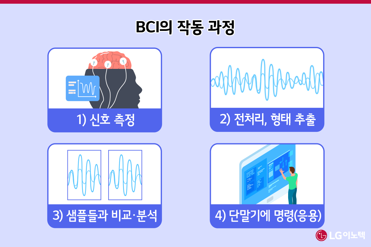BCI는 어떤 과정을 거쳐 뇌파를 활용할까요? 가장 우선되는 단계는 신호 측정입니다. 머리에 부착되거나 뇌 속에 삽입된 전극을 통해 뇌파를 측정하는데요. 컴퓨터가 뇌파를 처리할 수 있도록 뇌파 측정 기기에서 나오는 아날로그 신호를 디지털 신호로 바꾸는 단계입니다. 다음으로는 수집한 뇌파 데이터를 가공하는 전처리와 형태 추출의 과정을 거칩니다. 필터를 이용하여 수집한 뇌파의 잡신호를 제거하고, 분석에 필요한 신호를 분리한 다음 미약한 뇌파 신호를 증폭하여 분석하기 좋게 만드는 것이 전처리이고요. 형태 추출은 수집한 뇌파 데이터에서 중요한 정보와 그렇지 않은 정보들을 구분하여 신호의 인식률을 높이는 과정이에요. 이렇게 가공된 뇌파는 알고리즘을 통해 샘플들과 비교ㆍ분석하는데요. 분석된 뇌파 정보는 단말기(컴퓨터, 스마트폰, 웨어러블 기기 등)에 명령을 내리는 응용 단계에 이르게 됩니다.