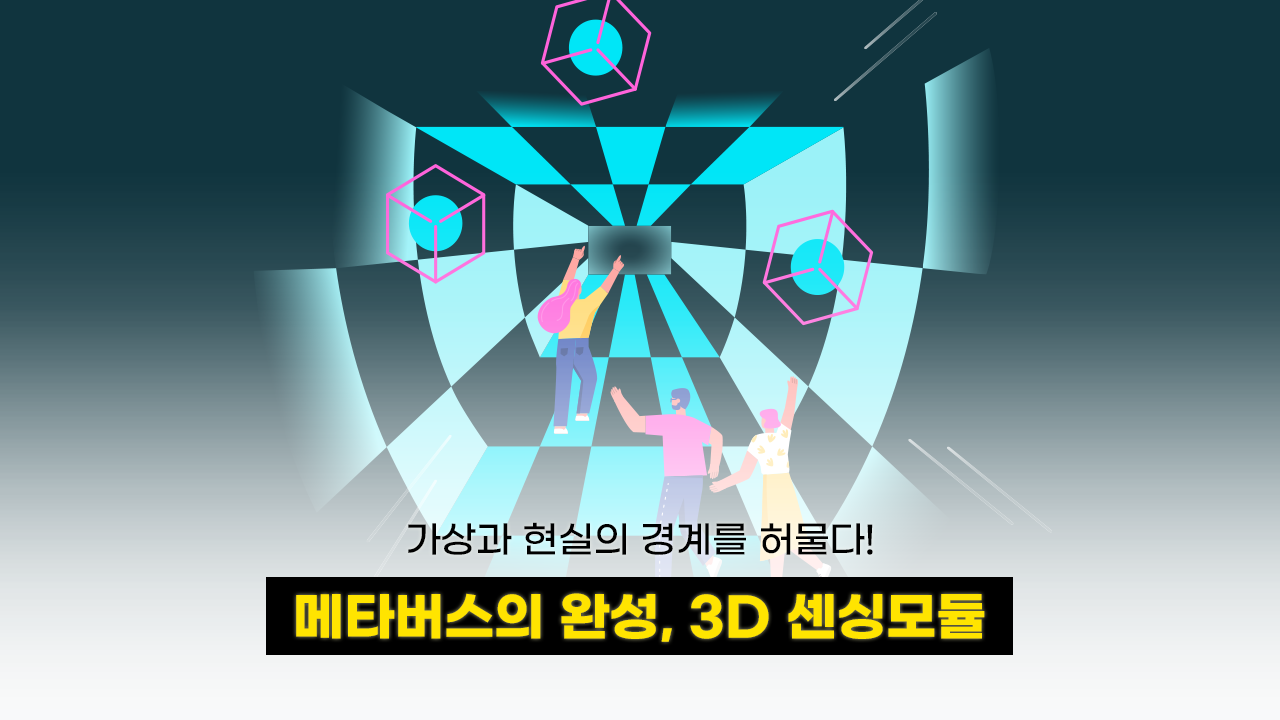 3D 센싱 카메라는 빛이 돌아오는 시간차를 이용한 ToF(Time of Flight) 등의 기술 기반으로, 사물의 입체감과 공간 정보, 움직임을 인식합니다. 이를 활용해 가상환경에 정보를 전달하고, 가상의 3D 오브제를 다시 현실 공간에 맞춰 옮기는 것도 가능해집니다!