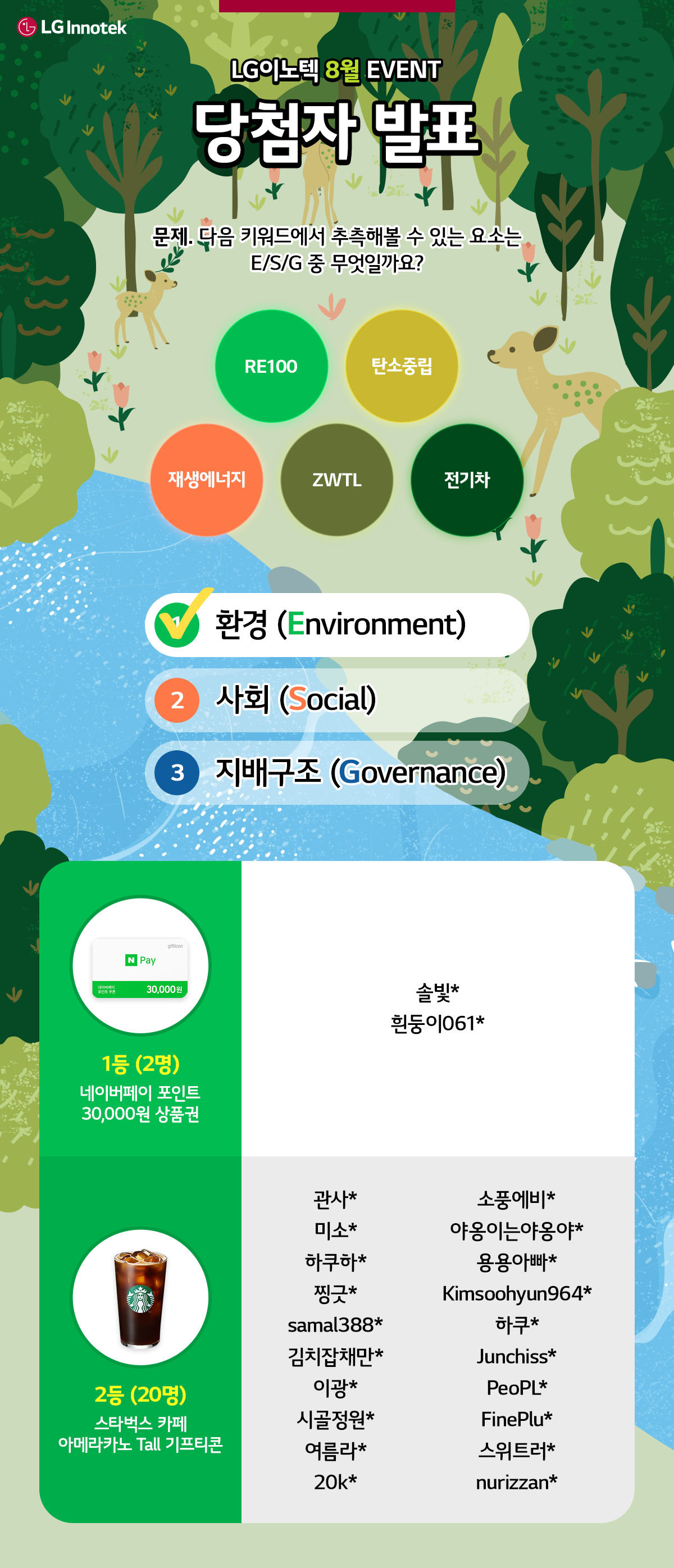 지난 23년 8월 17일(목)~8월 31일(목) 진행된 ‘LG이노텍 8월 삼지선다 퀴즈 EVENT’에 참여해주신 모든 분들께 감사드리며, 당첨자를 발표합니다!