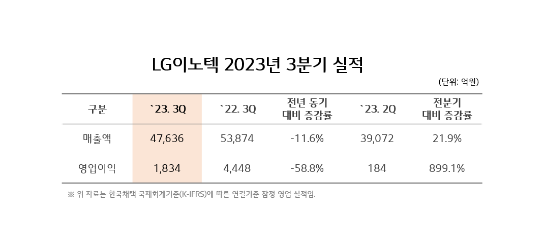 LG이노텍(011070, 대표 정철동)이 2023년 3분기에 한국채택 국제회계기준(K-IFRS)으로 매출 4조7,636억원, 영업이익 1,834억원을 기록했다. 전년 동기 대비 매출은 11.6%, 영업이익은 58.8% 감소했다. 전분기 대비 매출은 21.9%, 영업이익은 899.1% 증가했다.