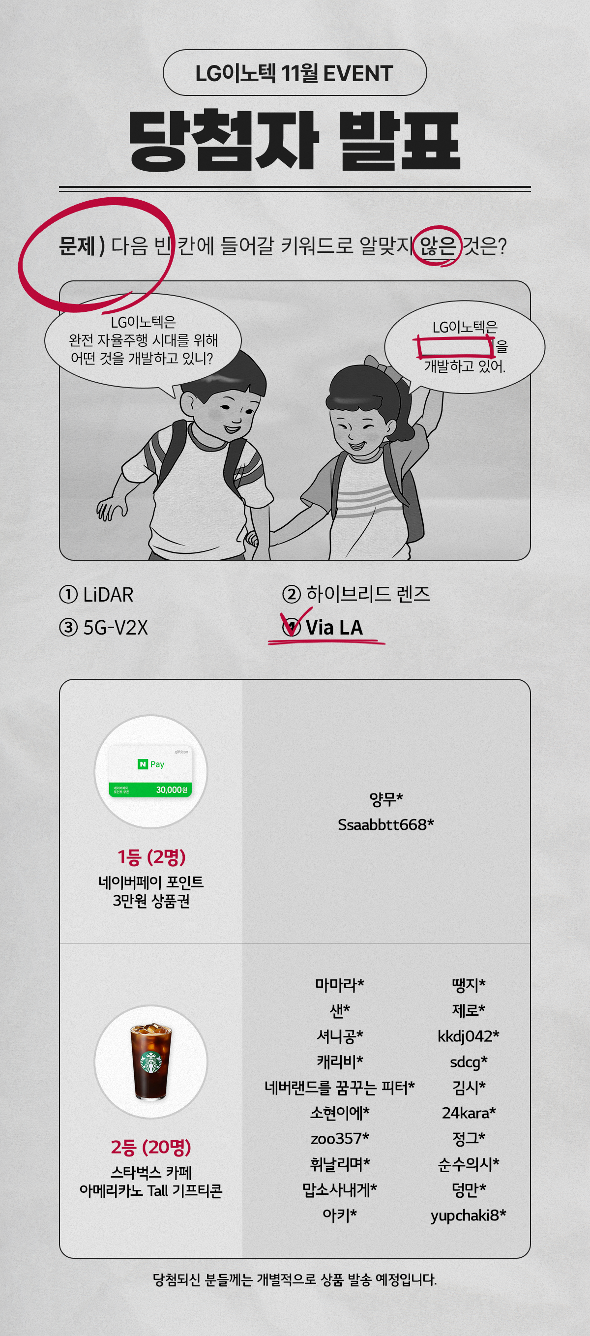 지난 23년 11월 14일(화)~11월 30일(목) 진행된 ‘LG이노텍 11월 이노텍고사 EVENT’에 참여해주신 모든 분들께 감사드리며, 당첨자를 발표합니다!