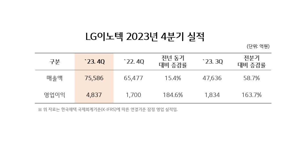 LG이노텍(011070, 대표 문혁수)이 2023년 4분기에 한국채택 국제회계기준(K-IFRS)으로 매출 7조5,586억원, 영업이익 4,837억원을 기록했다. 전년 동기 대비 매출은 15.4%, 영업이익은 184.6% 증가했다. 전분기 대비 매출은 58.7%, 영업이익은 163.7% 증가했다.