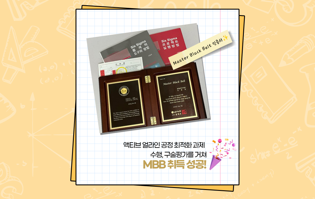 오랜 공부 끝에 저는 우리 회사의 핵심 기술인 '액티브 얼라인 공정'에 대해서 반응표면 실험으로 최적화를 하는 과제를 수행해냈고, 가까스로 구술평가에도 합격하여 MBB 취득에 성공했습니다.