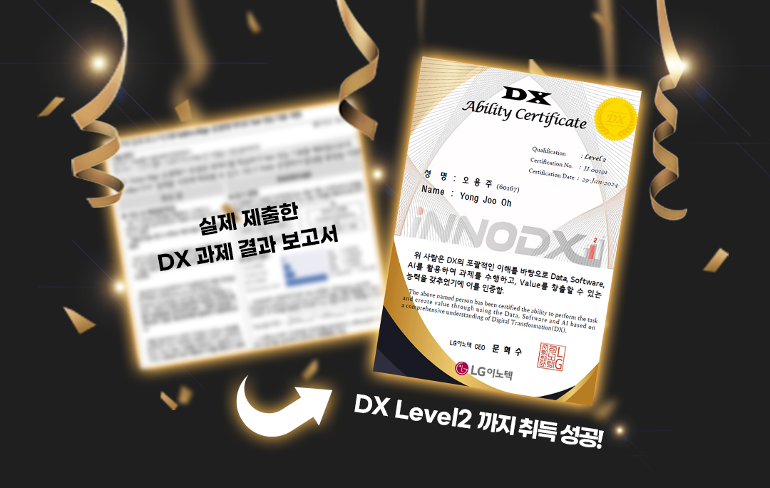 쉴 틈 없이 달려왔던 지난 직장 생활, 저는 오랫동안 출장 생활을 했던 구미 사업장을 떠나 파주로 이동하며 부서 변경을 두 번 거쳤습니다. 그 동안에 한 달 정도의 시간이 생겼고, 용기를 내어 DX Level 2와 MBB, 그리고 외부시험(데이터 분석)에 도전하기로 결심하고 바로 관련 교육과 시험을 신청했습니다.