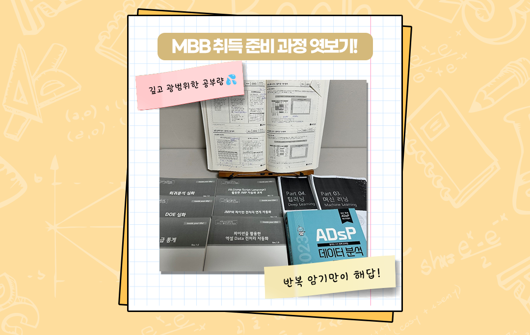 MBB 과정은 후보 MBB Pre Test, 후보 MBB 교육, 후보 MBB 이론평가, SSBD (Six Sigma by Big Data) 교육, 후보 MBB 과제 평가, 구술 평가처럼 교육기간도 길고 내용도 광범위해 깊이 있게 공부해야 했습니다. 50이 넘는 나이, 무언가를 외우고 공부하고 시험을 보려고 하니 정말로 어렵기 그지없었습니다. 외워도 돌아서면 까먹고, 또 외워도 내일이면 까먹고, 이해하고 외우고, 이해하고 외우고! 그야말로 반복밖에는 답이 없었죠.