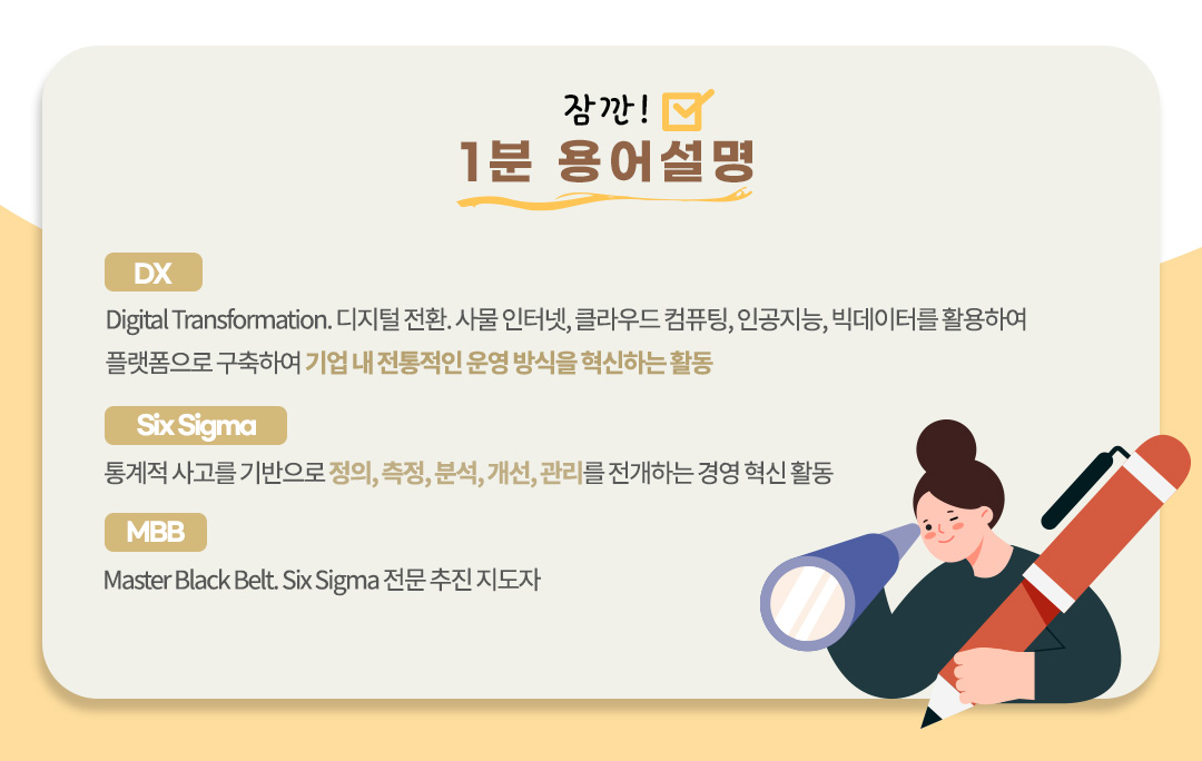 쉴 틈 없이 달려왔던 지난 직장 생활, 저는 오랫동안 출장 생활을 했던 구미 사업장을 떠나 파주로 이동하며 부서 변경을 두 번 거쳤습니다. 그 동안에 한 달 정도의 시간이 생겼고, 용기를 내어 DX Level 2와 MBB, 그리고 외부시험(데이터 분석)에 도전하기로 결심하고 바로 관련 교육과 시험을 신청했습니다.