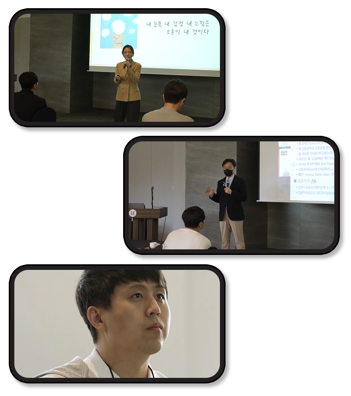 교육에 참여한 임직원들은 잠시 멈춰서 걸어온 길을 돌아보며 각자의 커리어 비전🌟에 대해 성찰하는 시간을 가졌죠. 구루피플스의 이창준 대표👲, 바른가치연구소 김진 대표👩 등 저명한 멘토들의 멋진 강연을 함께 들으면서요!