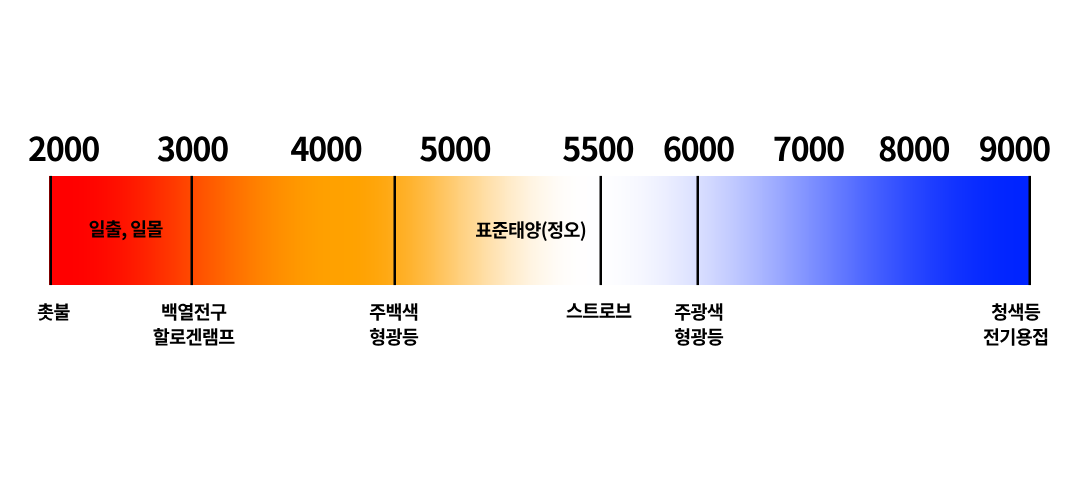 색 온도는 단위 'K'를 사용하는 Kelvin scale(켈빈 값)로 표현되며, 사진/영상 촬영 시 이미지의 분위기를 만드는 중요한 요소로서 사용됩니다.