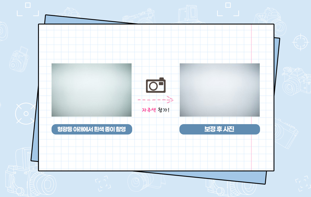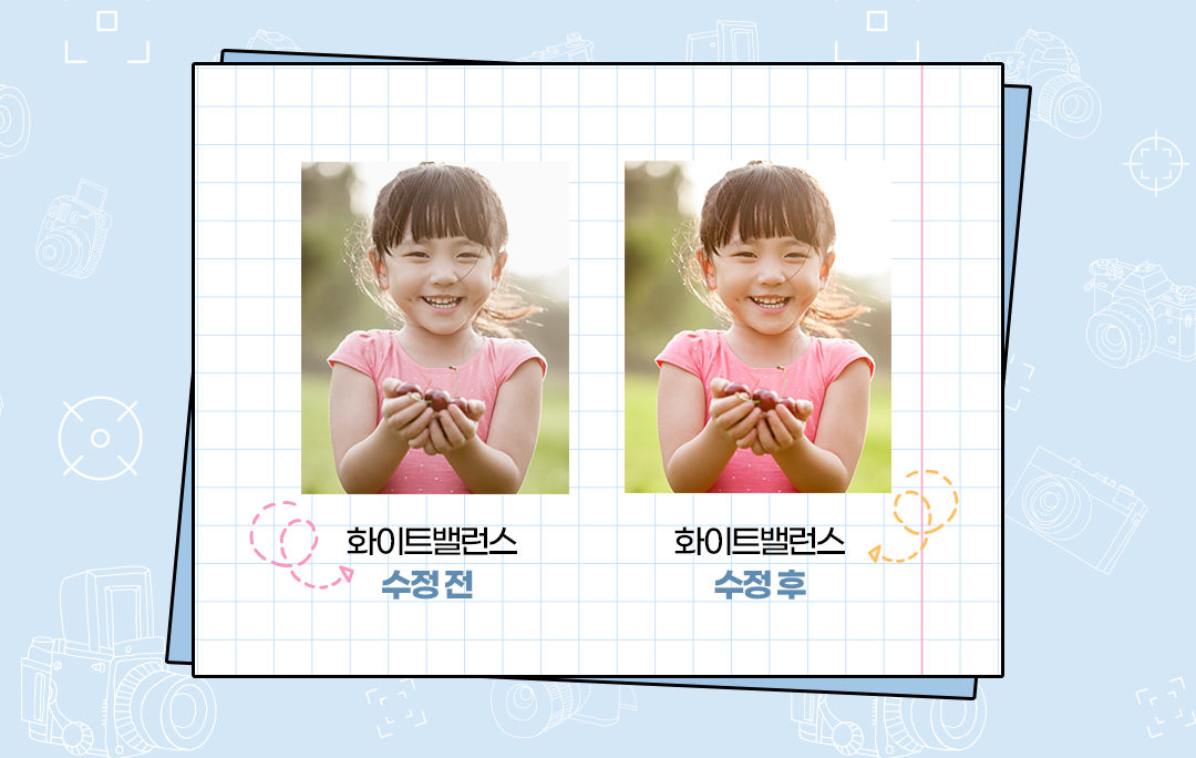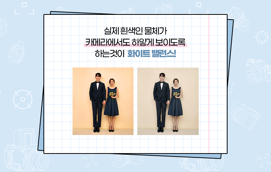 이러한 상황에서, '실제 흰 색인 물체가 카메라에서도 하얗게 보이도록’ 하는 것을 화이트밸런스라고 합니다.