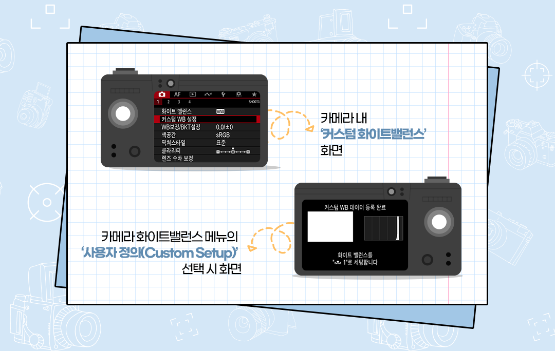 걱정 마세요! 다행히도 대부분의 카메라에는 '커스텀 화이트밸런스' 기능이 포함되어 있는데요. 카메라 내 커스텀 화이트밸런스 메뉴를 선택한 후 ‘사용자 정의(Custom Setup)’를 누르면 위와 같은 화면에서 손쉽게 조절할 수 있습니다. 해당 메뉴를 선택한 상태에서 주변 물품 중 가장 흰색에 가까운 것을 카메라 중앙에 위치시키고 촬영하면 완료!