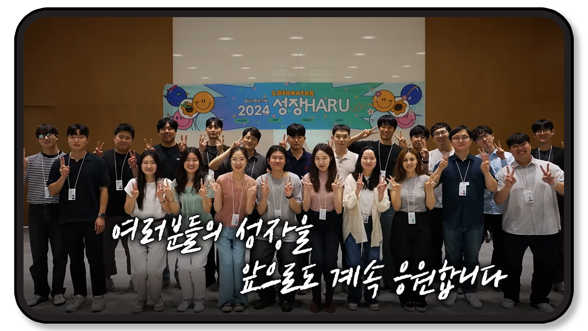 LG이노텍 입사 1주년 행사 ‘성장 HARU’ 현장입니다. 입사한 후 첫돌을 맞은 신입사원들이 다 함께 모여 지난 1년의 시간을 돌아보고, 앞으로 나아가야 할 방향을 고민하는 뜻깊은 시간!