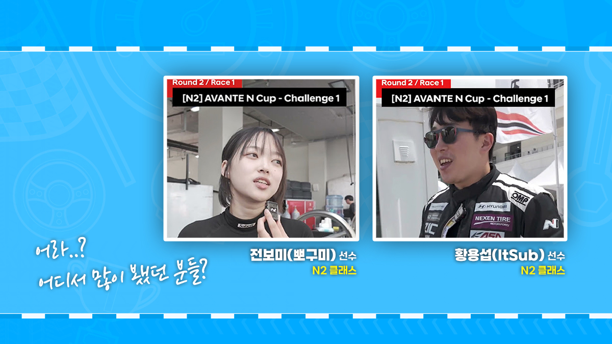 N2클래스는 시판되고 있는 아반떼N에 최소한의 성능과 안전을 위한 튜닝만을 하여 달리는 경기입니다. 현재 국내 아마추어 레이스 중에 가장 핫하다고 할 수 있는 경기로 참가 댓수가 70대에 육박하며, 예선 상위 26위까지만 Masters에 진출할 수 있고, 27~52위까지 Challenge에 참가할 수 있고, 나머지는 Callenge2로 아쉬움을 달래야 합니다. 댓수가 너무 많아 안전상의 이유로 예선도 A/B조로 나눠서 진행하고 있습니다. ItSub과 UpSub 채널을 운영 중인 IT 유튜버 황용섭 선수, 뽀구미 채널을 운영 중인 인터넷 방송인 전보민 선수, 모트라인 채널을 운영 중인 자동차 유튜버 윤성로 선수, 개그맨 양상국 선수, 배우 조재윤 선수가 출전하는 클래스가 바로 이 N2 클래스입니다.