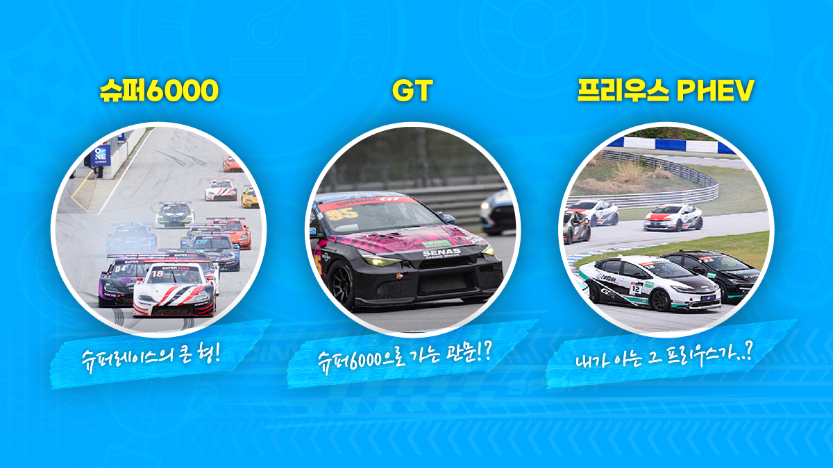 슈퍼레이스에는 여러 가지 클래스가 있는데, 가장 유명하고 인기 있는 클래스는 ✔ 슈퍼6000 입니다. 명실상부한 우리나라 최고의 클래스인만큼 국내 최고의 팀, 최고의 드라이버들이 참가하는 프로 경기입니다.