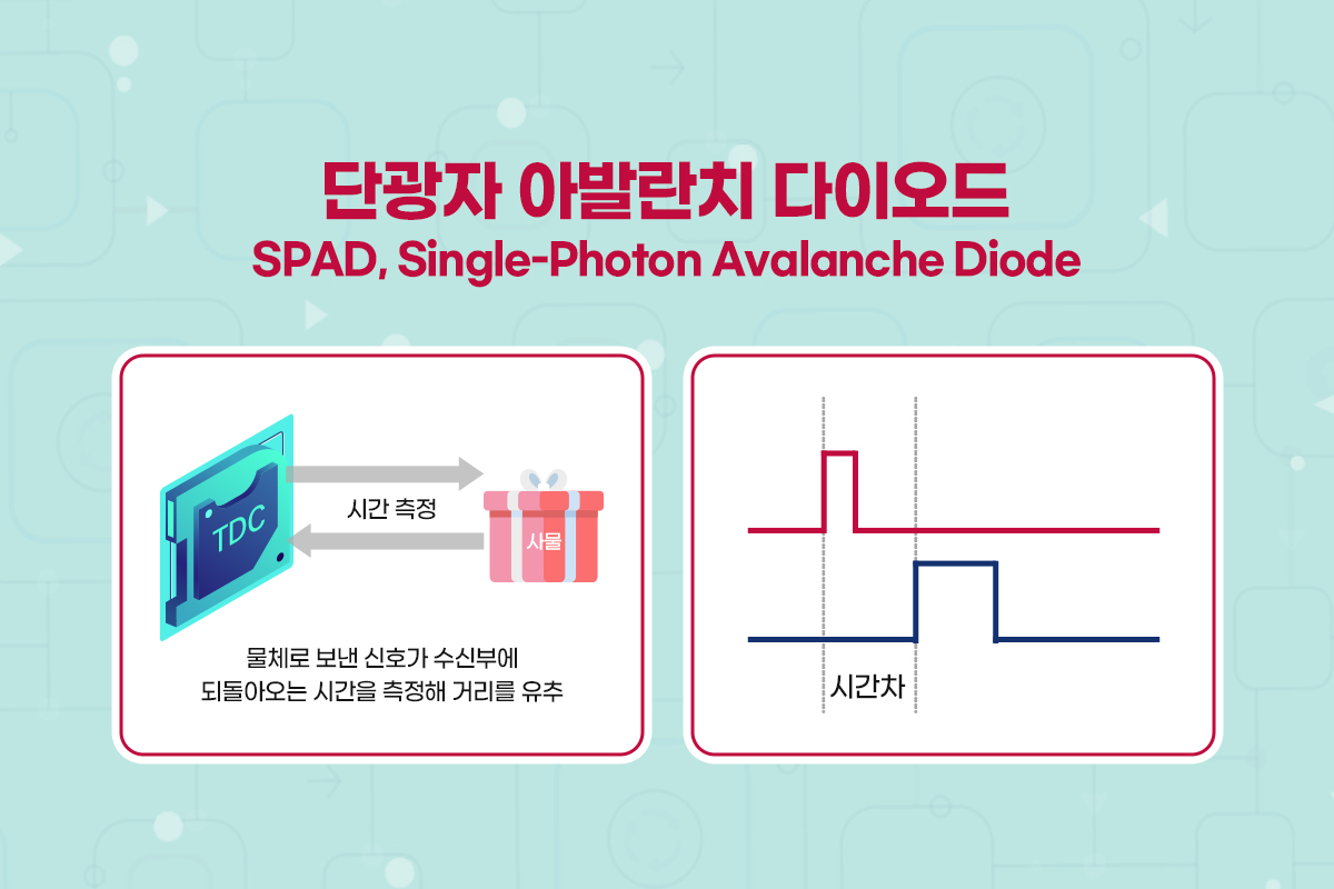 빛을 감지하는 장치로는 단광자 아발란치 다이오드(SPAD, Single-Photon Avalanche Diode)를 사용합니다. 반도체 레이저는 익숙해도 SPAD는 낯설 수 있는데요, 빛의 세기에 비례해서 전기 신호를 만들어주는 일반적인 센서와는 다르게 SPAD는 빛에너지의 최소 단위인 광자 하나만 들어와도 확률적으로 반응하여 감지할 수 있습니다.