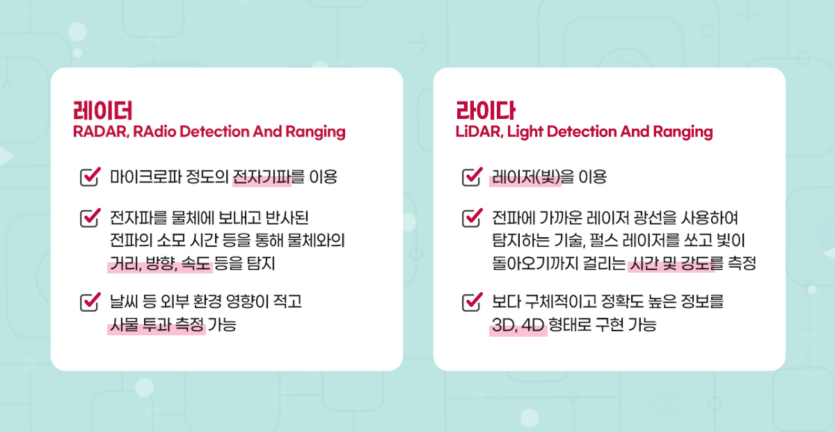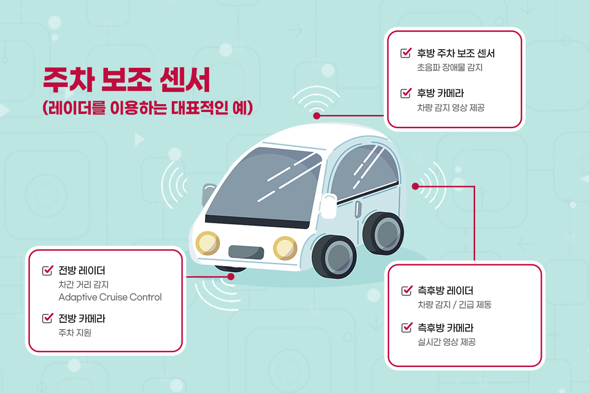 주차 보조 센서는 초음파를 사용해서 장애물이 얼마나 근접해 있는지를 운전자에게 알려 보다 수월하게 주차를 할 수 있도록 도와줍니다. 전방 레이더는 앞차와의 간격을 자동차가 인식하게 해 충돌할 것 같은 상황에서는 긴급제동을 하게 하거나 어댑티브 크루즈 컨트롤(Adaptive Cruise Control, 차량 전방에 장착된 레이다를 사용하여 앞차와의 간격을 적절하게 자동 유지하는 시스템)에서 상황에 맞게 속도를 조절합니다. 측후방 레이더는 사이드 미러의 사각지대에 있는 차량을 감지하여 차선 변경 시에 주의를 주거나, 후진으로 빠져나가는 상황에서 지나가는 차량을 감지해 긴급 제동을 해줍니다.