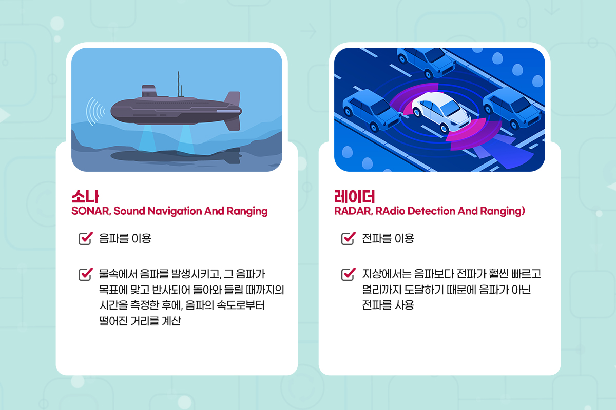 그 결과, 물속에서는 음파를 이용하는 소나(SONAR, SOund Navigation And Ranging)를, 땅 위에서는 전파를 이용하는 레이더(RADAR, RAdio Detection And Ranging)를 개발하였습니다.