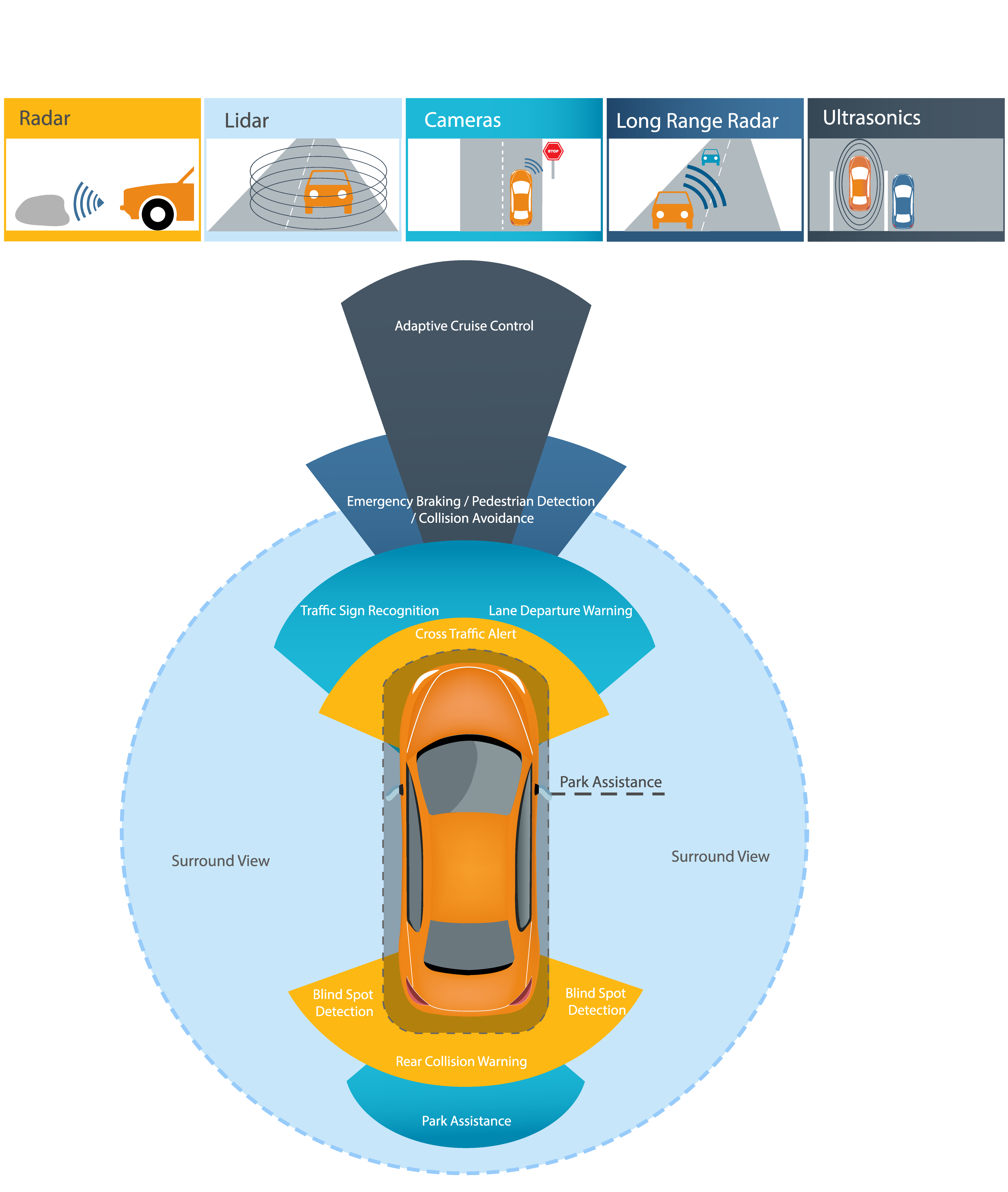 주차 보조 센서는 초음파를 사용해서 장애물이 얼마나 근접해 있는지를 운전자에게 알려 보다 수월하게 주차를 할 수 있도록 도와줍니다. 전방 레이더는 앞차와의 간격을 자동차가 인식하게 해 충돌할 것 같은 상황에서는 긴급제동을 하게 하거나 어댑티브 크루즈 컨트롤(Adaptive Cruise Control, 차량 전방에 장착된 레이다를 사용하여 앞차와의 간격을 적절하게 자동 유지하는 시스템)에서 상황에 맞게 속도를 조절합니다. 측후방 레이더는 사이드 미러의 사각지대에 있는 차량을 감지하여 차선 변경 시에 주의를 주거나, 후진으로 빠져나가는 상황에서 지나가는 차량을 감지해 긴급 제동을 해줍니다.