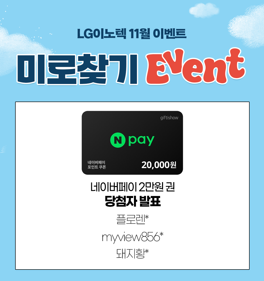 지난 11월 진행된 ‘LG이노텍 11월 EVENT #미로찾기’에 참여해주신 모든 분들께 감사드리며, 당첨자를 발표합니다!